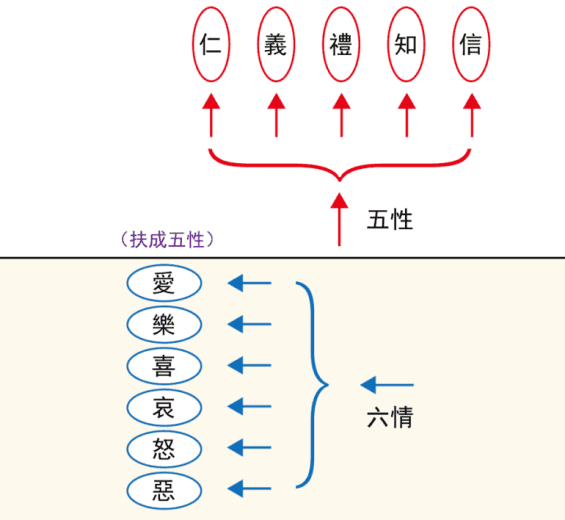 六书为什么是六个?其实这背后有深奥的意义。比如我画过“真情的力量(性、善、恶、欲、真、一)”,下面的层次就是“六情”。这个“六”代表着一种比较阴的层次,“天一生水,地六成之”,六代表的是大地以下偏阴层面的东西,自带贪婪属性,即:喜、怒、哀、乐、好、恶,这就是六情。这个“六”天生带有“离心力”。六书:象形、指事、转注、假借、形声、会意,每一个也都是一种“离心力”,它们的本质全部都是“分别”之力。